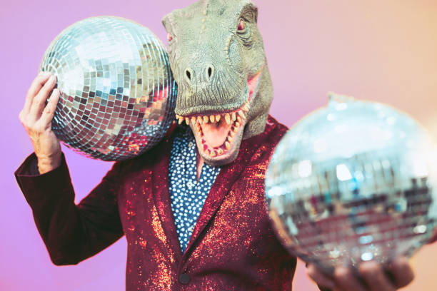 Senior man having fun wearing t-rex mask in discotheque – Elegant dinosaur masquerade male celebrating carnival party inside disco club – Funny absurd holidays and crazy people humor lifestyle concept